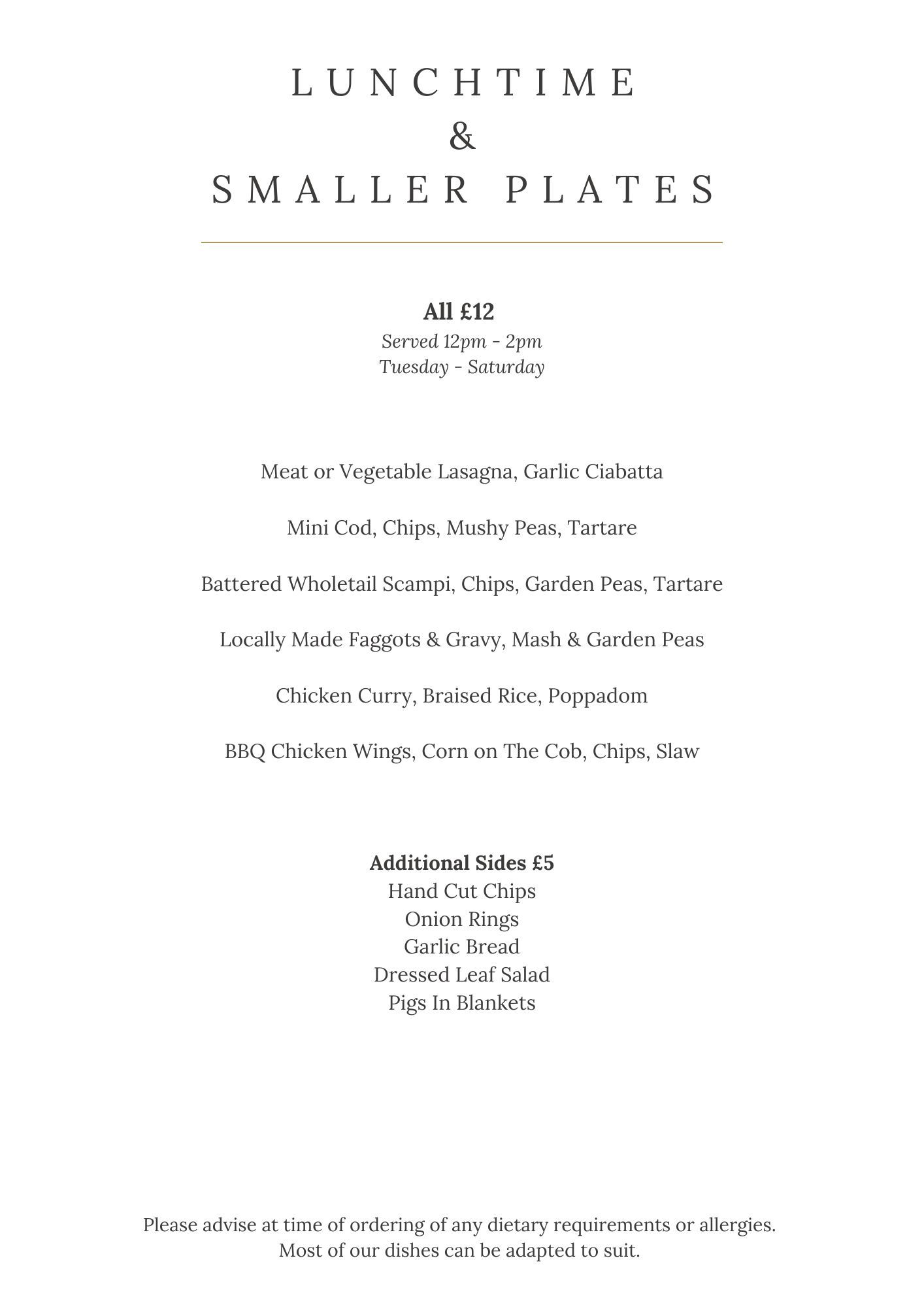 We do not have a separate Vegan or Gluten Free Menu as we pride ourself in creating dishes for you using the freshest Ingredients we have available on the day. Please make us aware on booking & we will ensure we have a menu for you.